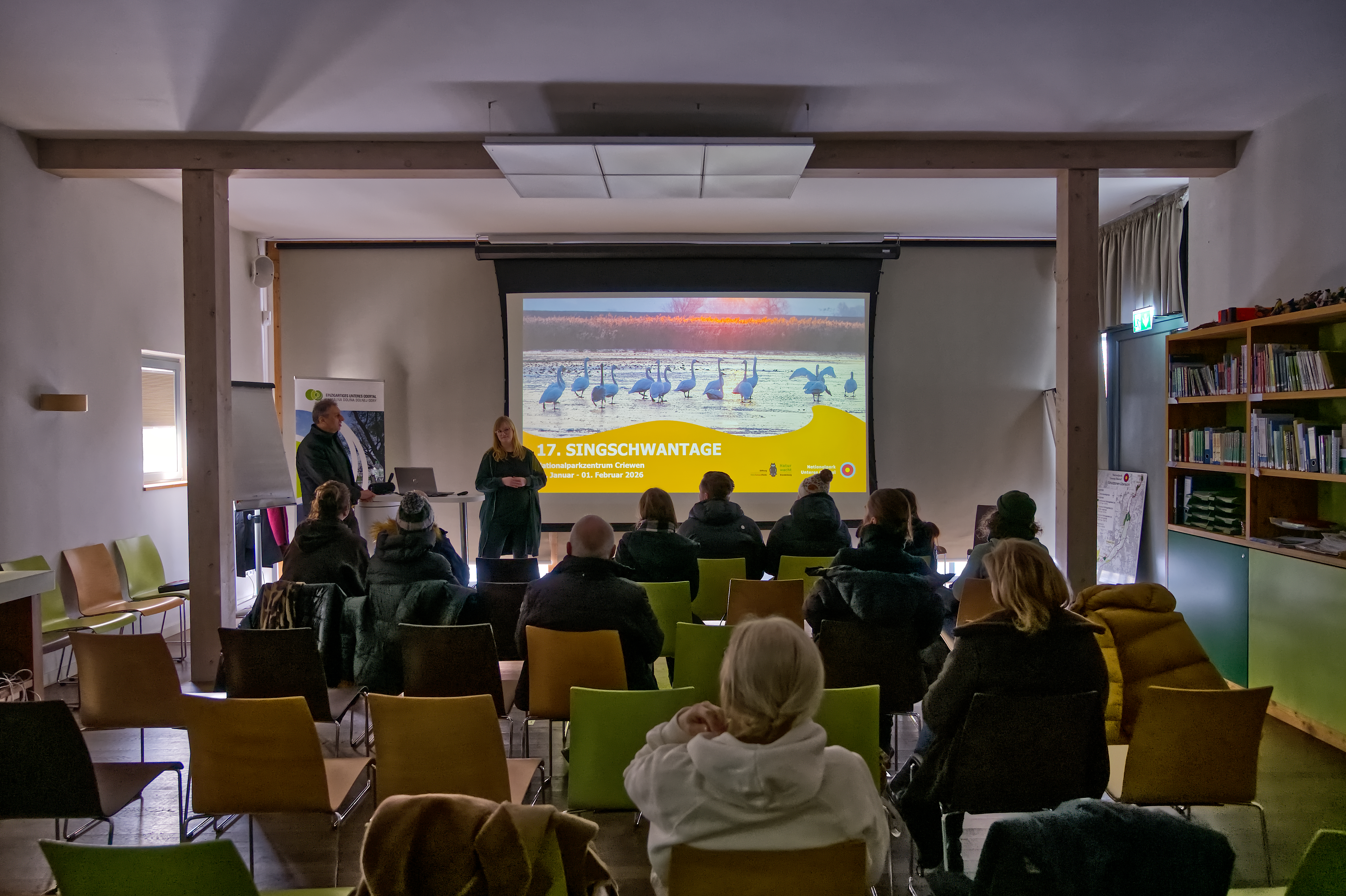 W sobotę, 31.01.2026 r., pracownicy Biblioteki Publicznej Miasta i Gminy w Dębnie oraz Centrum Polsko-Niemieckiego w Dębnie wzięli udział w wyjeździe do Criewen. Wyjazd związany był z obchodami Dni Łabędzia Krzykliwego w Nationalpark Unteres Odertal (Parku Narodowym Doliny Dolnej Odry) i odbył się on w ramach współpracy polsko-niemieckiej.   Program spotkania rozpoczął się od zwiedzania wystawy poświęconej przyrodzie parku i rzece Odrze. Uczestnicy mogli z bliska zobaczyć model ukazujący, jak Odra zalewa okoliczne tereny oraz jakie działania podejmuje się w celu kontroli i ochrony tego wyjątkowego środowiska naturalnego.